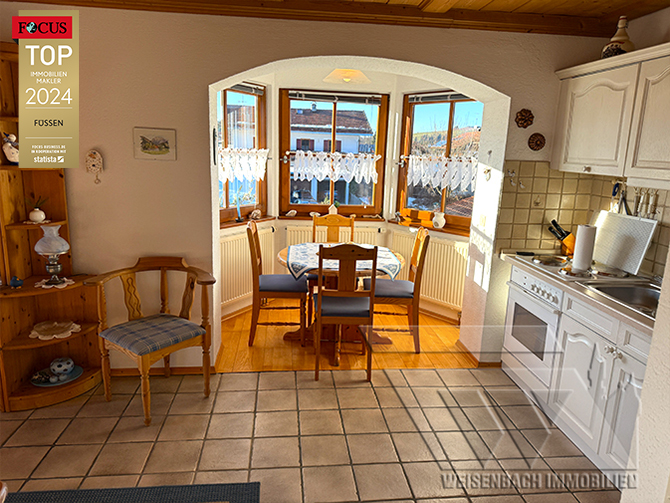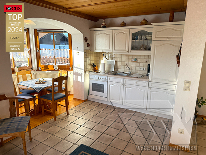 Hier können Sie Ihren Kaffee in der Morgensonne mit Blick zum Schloss Neuschwanstein genießen. Daneben befindet sich das, durch 2 Fenster sehr freundlich und helle Duschbad. Ebenso haben Sie eine separate mit Elektrogeräten, Töpfen und Geschirr komplett ausgestattete Küche.