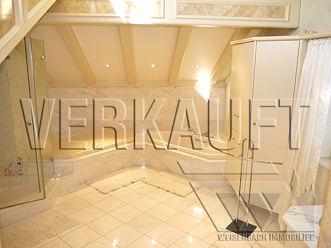 einer Kassettendecke, eine separate Küche mit Einbauküche und Zugang zur Terrasse, ein luxuriöses und ca. 20 m² großes Bad im Obergeschoss, ein Gästebad im Erdgeschoss, ein Gäste-WC, zwei große Terrassen, helle und sonnige Räume, einen Südwestbalkon eine Doppelgarage mit elektrischem Garagentor, einen schönen und pflegeleichten Garten, einen Sichtdachstuhl, elektrischen Rollläden, Massivholztüren und einen Grundwasserbrunnen – um Ihnen nur einige der vielen Highlights dieser Immobilie zu nennen.